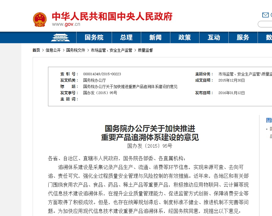 2015年,《国务院办公厅关于加快推进重要产品追溯体系建设的意见》发布,在文件中,国务院强调围绕婴幼儿配方食品、肉制品、乳制品、食用植物油、白酒等食品,督促和指导生产企业依法建立质量安全追溯体系,切实落实质量安全主体责任。